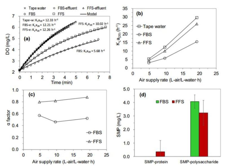 圖2.?(a)FBS及其排出水, FFS及其排出水,?自來(lái)水氧轉運試驗中的溶解氧濃度(mg/L);不同曝氣條件下,FBS和FFS的(b)KLa值;(c)α-因子值;(d)FBS和FFS的溶解性微生物產(chǎn)物(SMPs):蛋白和多糖濃度(mg/L)