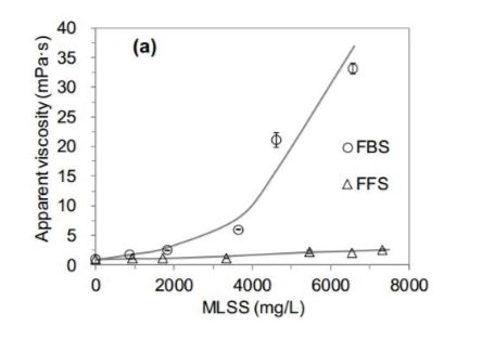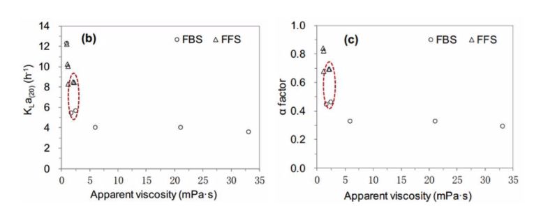 圖4. FBS和FFS的表觀(guān)粘度與(a)MLSS、(b)KLa(20)和(c)α-因子的相關(guān)性。