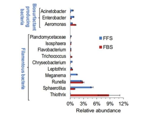FBS和FFS的菌群結構如圖7所示。FBS和FFS含有大量的共有菌,其中絲硫菌屬(thiothrix)、球衣菌屬(Sphaerotilus)、古字狀菌屬(Runella)、meganema(甲基桿菌科分類(lèi)下的屬)、纖毛菌屬(Leptothrix)、金黃桿菌屬(chryseobacterium)、毛球菌屬(Trichococcus)、黃桿菌屬(Trichococcus)、isosphaera(浮霉菌科分類(lèi)下的屬)和浮霉菌科(planctomycetaceae)是FBS和FFS豐度排名前十的菌;?FBS和FFS的優(yōu)勢菌存在差異,未分離培養(uncultured)的噬纖維菌(cytophagaceae)和鞘脂桿菌(sphingobacteriales)分別在FBS和FFS中豐度最高;FFS和FBS的所有菌在各自反應器的排出水中均被檢測到。從圖8來(lái)看,絲硫菌屬(thiothrix)在FFB中的相對豐度超過(guò)8.5%,而在FFS中數量極少,絲硫菌屬(thiothrix)的長(cháng)菌絲(0.5-1.5 μm)會(huì )連接污泥絮狀物,導致污泥降解能力降低,污水的表面粘度增加;盡管球衣菌屬(Sphaerotilus)和古字狀菌屬(Runella)在FFS和FBS中的豐度均較高,但它們的菌絲較短,對污泥沉降、表觀(guān)粘度和氧轉運的負面影響較??;其他絲狀細菌的豐度較低,影響程度較小。因此推測,絲硫菌屬(thiothrix)就是影響FBS氧轉運的最大“元兇”。從種水平來(lái)看,絲硫菌屬(thiothrix)分類(lèi)下的eikelboomii是FBS的優(yōu)勢菌,至此,“真兇”也基本確定。