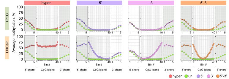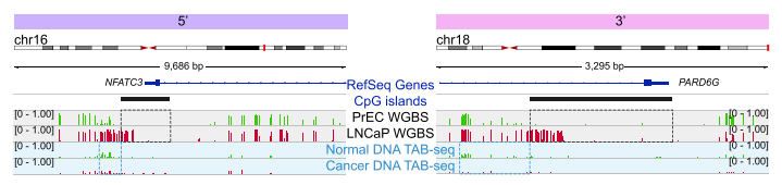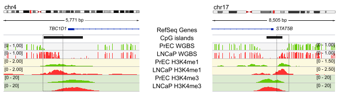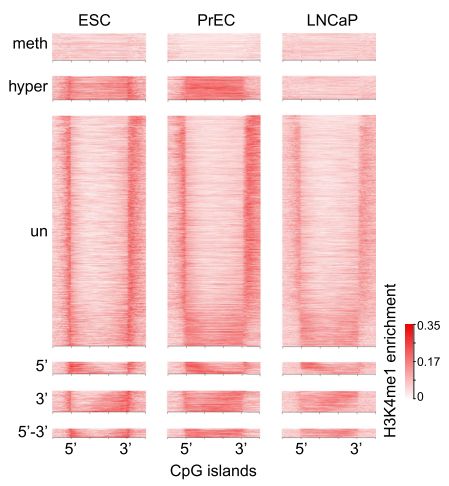 采用chip-seq數據,分析H3K4me1在癌癥CpG島超甲基化中的富集方式。H3K4me1高富集于hESCs CpG島的body區,在癌癥中呈現廣泛超甲基化。相反,癌癥中未甲基化的CpG島,在hESCs中表現為邊界雙峰富集及島區域降低。并且,文章發(fā)現一種hESCs中不對稱(chēng)的H3K4me1富集模式,在對應5’或3’內CpG島邊界,易于癌癥中DNA甲基化。通過(guò)可視化圖展現了候選的CpG島,顯示癌癥中5’和3’的甲基化堆積,可以由正常前列腺細胞中H3K4me1預先標記。