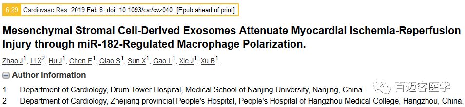 該研究由南京大學(xué)醫學(xué)院附屬鼓樓醫院的學(xué)者完成,題目:間充質(zhì)基質(zhì)細胞來(lái)源的外泌體通過(guò)miR-182調節巨噬細胞極化減弱心肌缺血再灌注損傷。