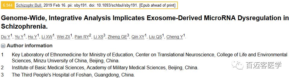 文獻二:Du Y, Yu Y, Hu Y, et al. Genome-Wide, Integrative Analysis Implicates Exosome-Derived MicroRNA Dysregulation in Schizophrenia[J]. Schizophr Bull. 2019 Feb 16.