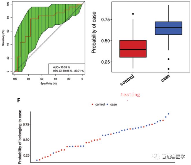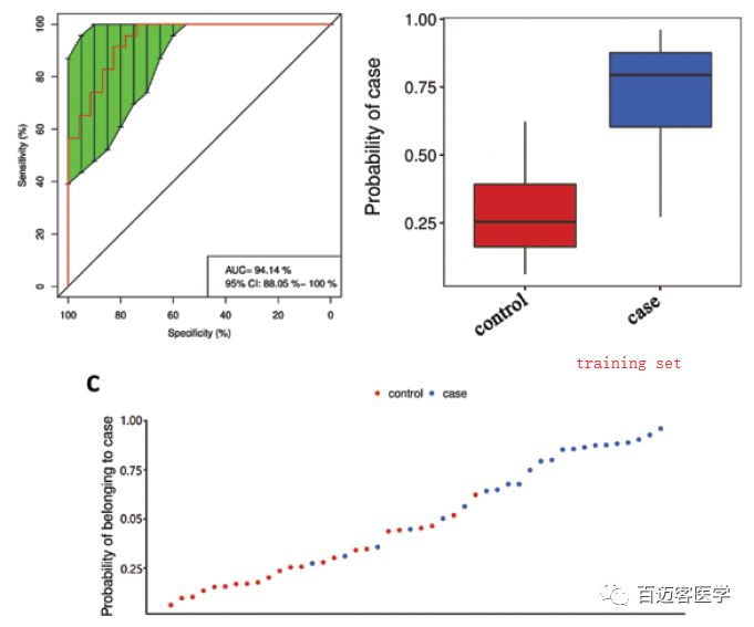 使用training set鑒定到一組11個(gè)miRNA,其AUC(Area Under Curve)為0.94 (95% CI, 0.88–1.0),敏感性0.783,特異性0.957。