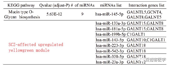 比如hsa-miR-206,其是SCZ患者的血液外泌體中最顯著(zhù)上調的miRNA,并且之前報道其調節腦源性神經(jīng)營(yíng)養因子BDNF表達。顯著(zhù)相關(guān)miRNA共表達模塊靶基因顯著(zhù)富集到了O型聚糖的生物合成等通路,GO富集到了神經(jīng)遞質(zhì)轉運蛋白、樹(shù)突棘和樹(shù)突發(fā)育相關(guān)term。