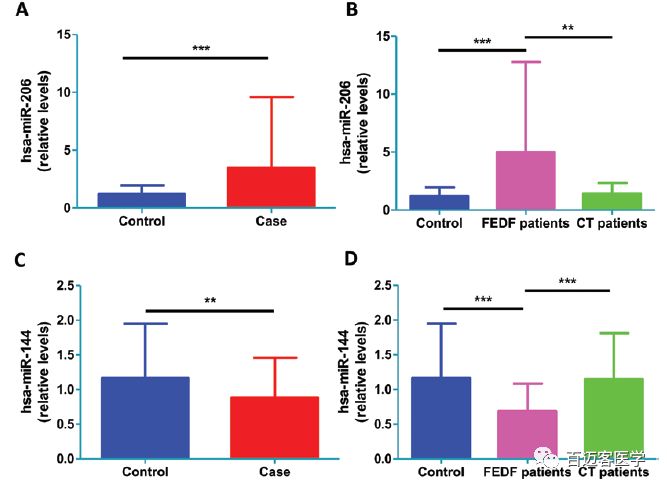 qRT-PCR驗證:100個(gè)SCZ患者(57例第一次發(fā)作未用藥患者FEDF和43例長(cháng)期治療患者CT)vs?100個(gè)對照對于hsa-miR-206、hsa-miR-144-3p其驗證結果與二代測序一致,且經(jīng)過(guò)長(cháng)期治療在CT組其水平會(huì )向正常組趨近。靶基因表達和elisa結果顯示SCZ患者血液中BDNF mRNA和蛋白質(zhì)水平降低。greenyellow模塊中靶基因GALNT8和GALNT15也顯著(zhù)降低。