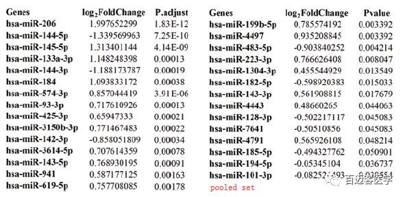 3)pooled set:綜合上述2個(gè)set,共計6個(gè)miRNA符合上述條件:6 miRNAs (hsa-miR-206、hsa-miR-145-5p、hsa-miR-133a-3p、hsa-miR-144-5p、hsa-miR-144-3p和hsa-miR-184)。