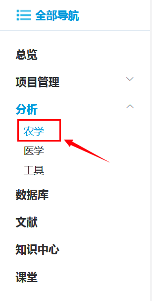 首先,您需要登錄到百邁客云平臺網(wǎng)址(http://www.biocloud.net/),點(diǎn)擊全部導航->分析->農學(xué)