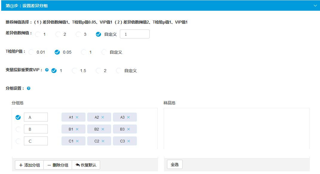 設置差異分析的條件:包括差異倍數、T檢驗p值、VIP值、以及差異分組
