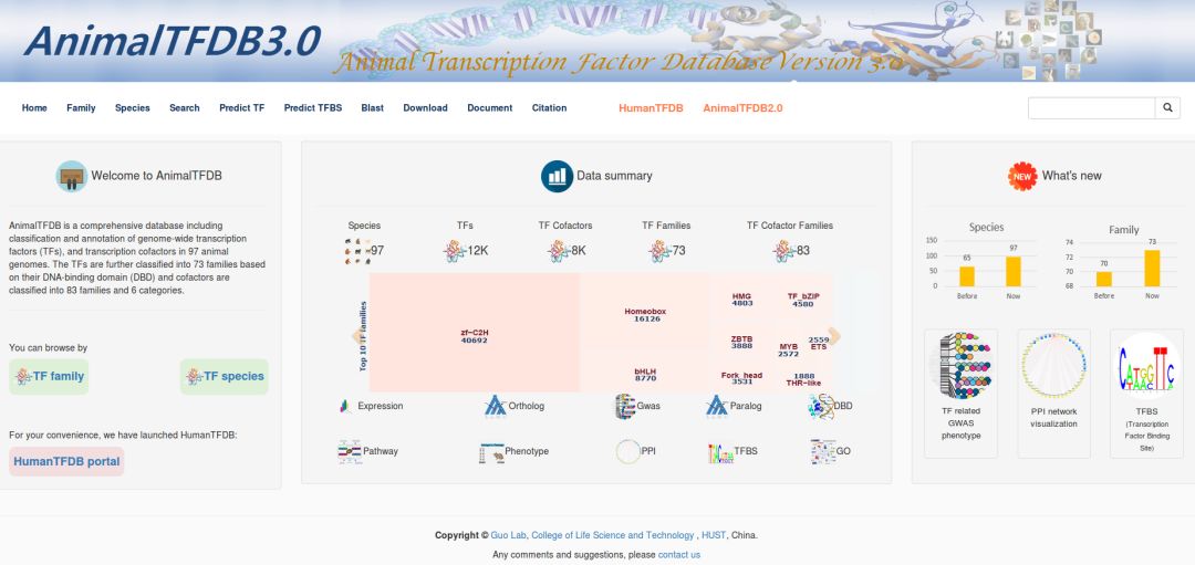 顯而易見(jiàn),這兩個(gè)數據庫分別收錄了動(dòng)物和植物的TF,包含轉錄因子注釋和預測等。這里小編著(zhù)重說(shuō)一下AnimalTFDB。AnimalTFDB 3.0數據庫去年9月份更新,是華中科技大學(xué)郭安源教授團隊建立并維護的。