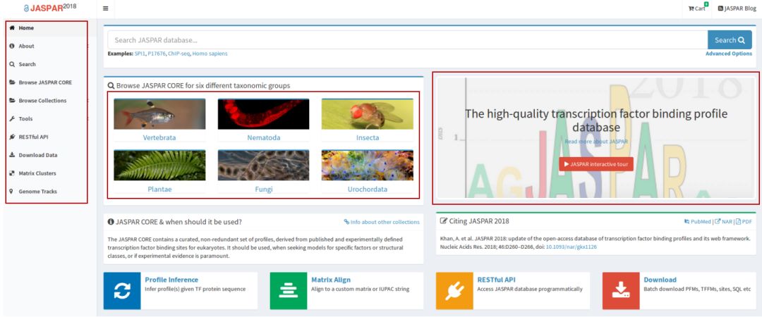 新版本除了在數據上的擴展外,還提供多種搜索瀏覽方式(Famliy、Species或自定義搜索)、2個(gè)在線(xiàn)預測工具Predict TF和Predict TFBS(分別可以批量預測轉錄因子和預測DNA序列上的轉錄因子結合位點(diǎn))。