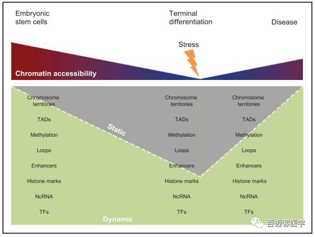 作者以此研究為基礎,結合前人研究結果,構建了發(fā)育和疾病發(fā)生中表觀(guān)基因組的變化模型(如下圖)。發(fā)育過(guò)程中伴隨著(zhù)染色質(zhì)的變化,使最終分化的細胞具有穩定的轉錄組,而疾病破壞了這種平衡,通過(guò)影響染色質(zhì)結構、增強子-基因loop、組蛋白修飾、DNA甲基化等,將基因組的特定區域轉變?yōu)楦鼊?dòng)態(tài)的構象。