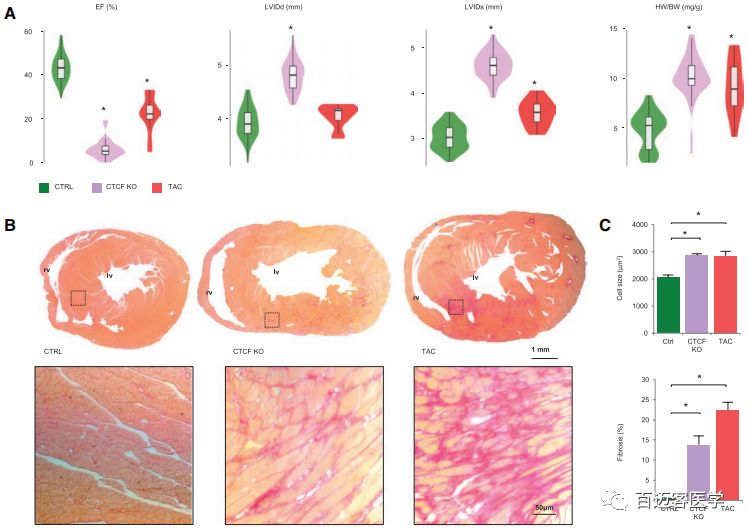 對CTCF-KO小鼠的表型呈現明顯的心肌病,失去CTCF會(huì )導致射血分數受損、左心室擴張以及器官和細胞水平的肌肉肥厚。而TAC小鼠也表現出肥厚,并伴有較輕微的心室大小和射血分數的變化,這表明CTCF-KO和TAC小鼠代表了不同的病理生理模型。