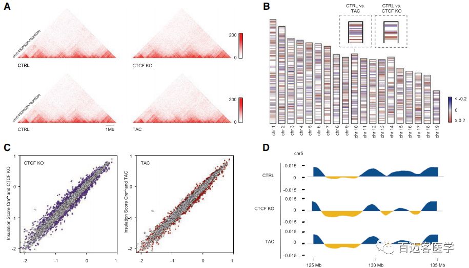 正常對照成年小鼠(CTRL)和兩個(gè)不同的疾病模型(TAC、CTCF-KO)小鼠的Hi-C結果揭示了5 kb分辨率下心肌細胞的基因組相互作用,得到了染色體內和染色體間的互作事件,并為未來(lái)的心臟表觀(guān)基因組研究提供了依據。壓力超載或CTCF缺失選擇性地改變了TAD的邊界強度和A/B?compartment、基因組可及性。心力衰竭涉及致病基因周?chē)旧|(zhì)互作穩定性的降低。此外,壓力超負荷或CTCF缺失重塑了心臟增強子的長(cháng)距離互作,導致這些功能元件周?chē)植咳旧|(zhì)互作顯著(zhù)減少。