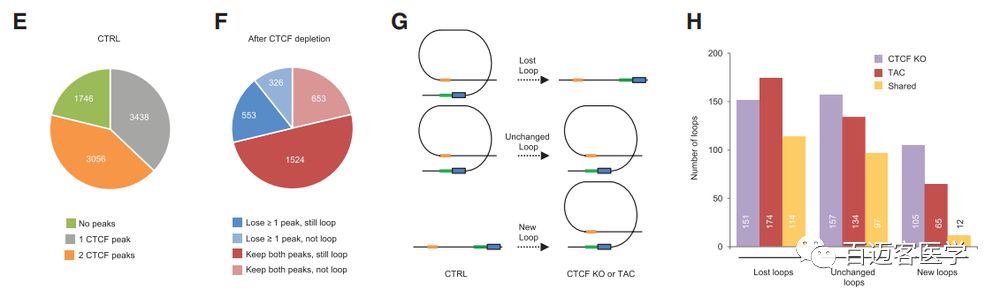 CTCF-KO、TAC小鼠的染色體長(cháng)距離loop大小沒(méi)有明顯變化,但loop總數量減少。相比于對照組,CTCF-KO和TAC中消失的長(cháng)距離loop中有51%兩者共有的,而新出現的loop中只有15%是兩者共有的;在疾病細胞中丟失的loop數大于新形成的loop數。在疾病細胞中發(fā)生重組(丟失/新形成)的loop中,富集與心血管功能相關(guān)通路中的基因。此外,重組loop中亦包含大量增強子–啟動(dòng)子loop,其中在疾病細胞中丟失的loop富集與心臟病理相關(guān)的基因。