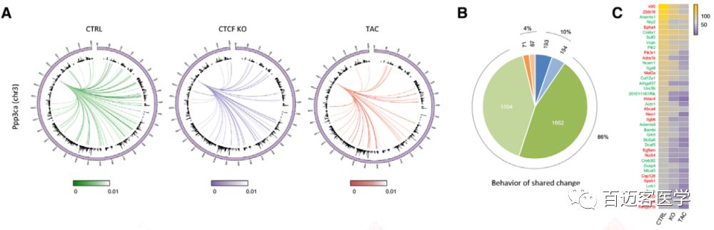 存在互作的9194個(gè)表達基因中,60%的基因在CTCF-KO和TAC中的互作變化方向相同。而剩余的40%基因中大多數(75%)是在某一組疾病細胞中虎作沒(méi)有發(fā)生變化的,25%是互作變化在兩組中相反的。在CTCF-KO和TAC中互作改變相同且差異表達的3651個(gè)基因中,絕大多數(86%)的局部互作減少(圖4B)。這些發(fā)現支持了這樣一種趨勢,即更多的動(dòng)態(tài)染色質(zhì)互作影響基因表達,兩組疾病細胞與對照相比,它們的基因表達變化方向更可能趨向一致?;プ鲾盗縯op 40的差異表達基因在疾病細胞中的互作持續下降,如與鈣依賴(lài)信號和心肌肥厚相關(guān)的基因Ppp3ca。