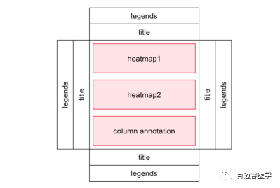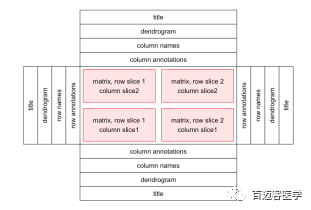 單個(gè)熱圖由熱圖主體和熱圖組件組成。 熱圖主體可以按行和列分割。 熱圖組件是標題,樹(shù)形圖,矩陣名稱(chēng)和熱圖注釋?zhuān)鼈兎旁趆eamap體的四個(gè)側面上。