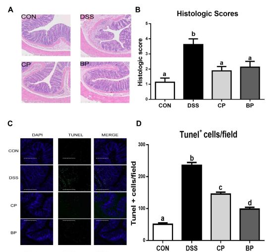 圖2. CP和BP對大鼠結腸組織的損傷修復。A:末端結腸HE染色;B:組織病理半定量分值(結腸損傷、白細胞滲透);C:結腸細胞凋亡的組織學(xué)切片鏡檢;D:TUNEL法檢驗結腸細胞凋亡(個(gè)數/面積)。