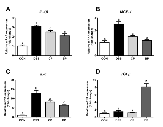 圖3. CP和BP對大鼠結腸炎癥相關(guān)基因表達的影響。A:白細胞介素(IL-1β);B:?jiǎn)魏思毎吇鞍祝∕CP-1);C:白細胞介素(IL-6);D:轉化生長(cháng)因子(TGF-β)。