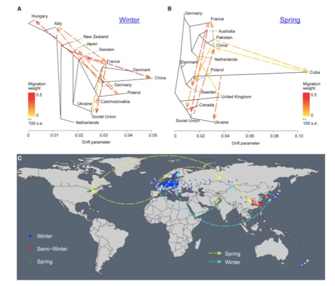 進(jìn)一步計算世界地圖上顯著(zhù)的基因流數目之后,在冬型和春型油菜中發(fā)現了四個(gè)主要基因流(圖2C)。冬型油菜的基因流從法國到俄羅斯(weight=0.5)、法國到瑞典(weight==0.3)、波蘭到日本(weight==0.3)和日本到中國(weight==0.3),而春型油菜的基因流從法國到俄羅斯(weight==0.5)、法國到瑞典。經(jīng)德國(weight=0.4),瑞典到加拿大(weight=0.2),加拿大到中國(weight=0.5)。沒(méi)有顯著(zhù)的生態(tài)型漂移事件(inter-ecotype drift events)(圖2 A、B)。