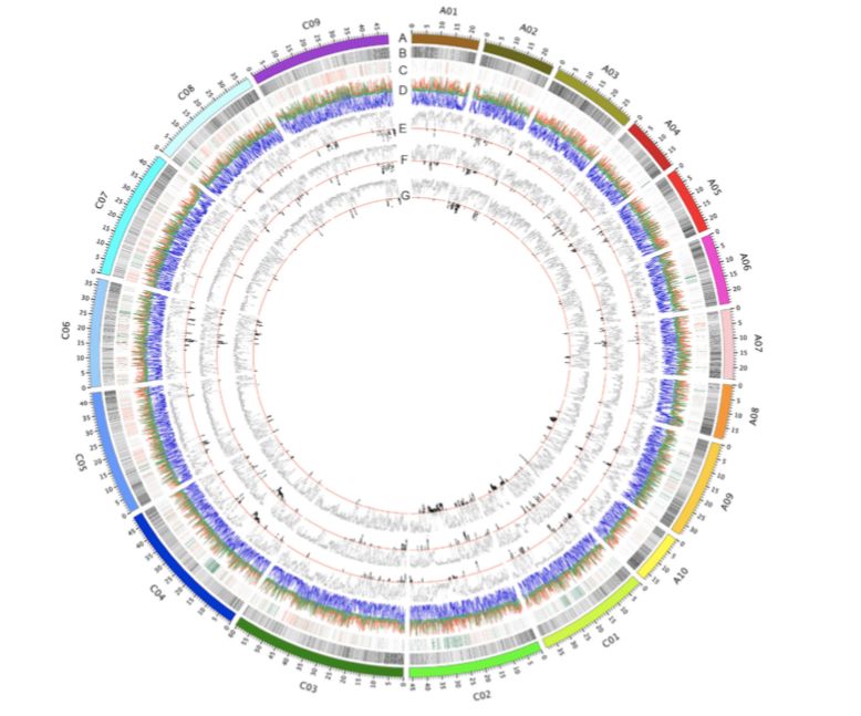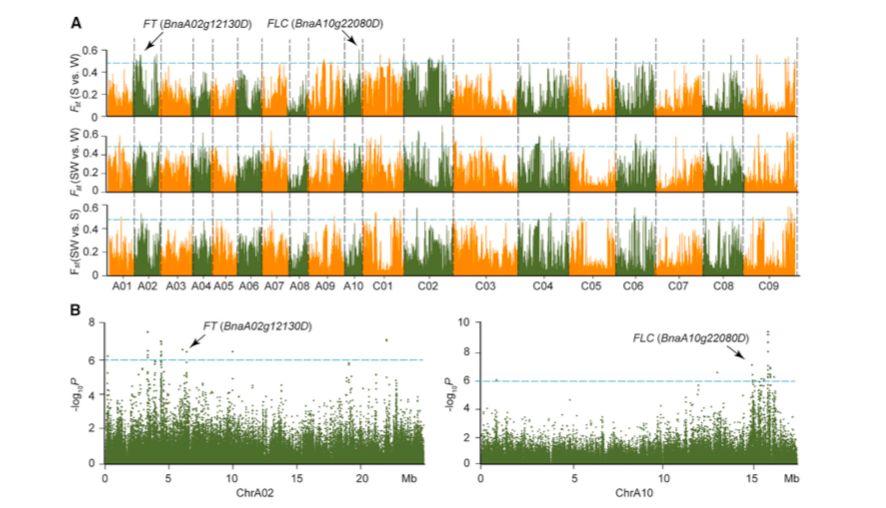 該研究對991份油菜天然種質(zhì)資源進(jìn)行了遺傳多樣性的測序和鑒定。通過(guò)對兩個(gè)不同的參考基因組,即“Darmor-bzh”和“Tapidor”基因組的定位讀數產(chǎn)生的兩組SNPs的群體遺傳學(xué)分析,得出了一致的結論。遺傳多樣性和連鎖不平衡參數表明甘藍型油菜兩個(gè)亞基因組的進(jìn)化是不對稱(chēng)的。選擇性?huà)呙璺治鼋沂玖伺c調控植物發(fā)育和應激反應的各個(gè)方面相關(guān)的基因的遺傳變化。并對影響開(kāi)花時(shí)間的SNPs進(jìn)行了探索。