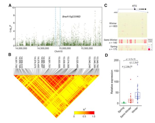 BnaA10g22080D是擬南芥FLC的一個(gè)假定的同源基因,在Chr.A10的14.99-15.01 Mb之間的區域內被鑒定(圖3B)。GWAS和LD分析表明,BnaA10g22080D的5’調控區的SNPs與品種間開(kāi)花時(shí)間的變化顯著(zhù)相關(guān)(圖6A和6B)。