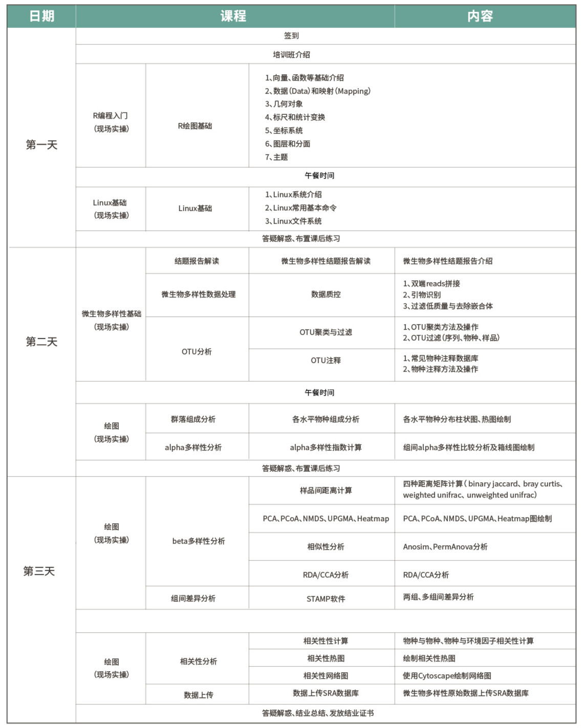 本次課程通過(guò)采用理論和實(shí)踐緊密結合的教學(xué)形式,以理論基礎至數據挖掘層層遞進(jìn)的方式,讓大家在短時(shí)間內對微生物研究中涉及的知識和方法得到迅速提升。同時(shí),在3天課程中,我們現場(chǎng)會(huì )有講師與助教與大家面對面的咨詢(xún)探討在研究思路、以及分析方面等遇到的問(wèn)題,從而在多元思維中幫助大家開(kāi)拓思路,挖掘微生物更多的價(jià)值。