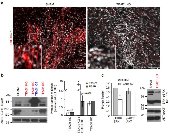 TEAD1KO異種移植樣本中EGFR的表達水平低于對照樣本,且TEAD1KO細胞系中EGFR表達相比于正常對照細胞系顯著(zhù)下調,TEAD1過(guò)表達后EGFR表達有回升。對EGFR下游信號元件的表達水平的檢測發(fā)現,pERK在TEAD1KO細胞中下調,而pAKT則不同。TEAD1KO細胞經(jīng)過(guò)較長(cháng)時(shí)間的培養后,EGFR表達恢復,而遷移仍受影響。因此,TEAD1直接且短暫地調控EGFR。