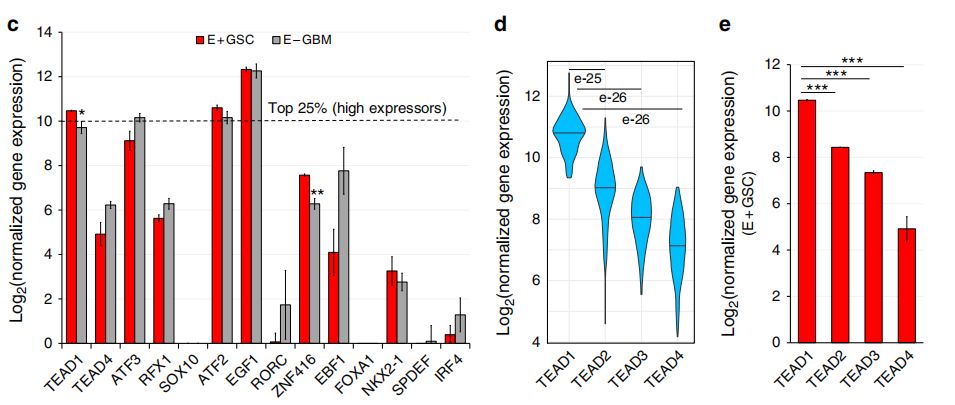 通過(guò)ATAC-seq分析染色質(zhì)的可及性,不僅可以識別轉錄的調控區域,還可以推斷出其中的TF活性。在此,作者鑒定了27個(gè)GSC腫瘤特異性的TF motif,26個(gè)在E+GSC和E+NSPC中共有的發(fā)育相關(guān)TF motif。其中,TEAD1/4是具有很高活性的TF( motif是GSC特有peak中顯著(zhù)富集,且基因表達水平高),其它候選TF包括ATF3、RFX1、FOXA1等。而E+GSC和E+NSPC中共有的發(fā)育相關(guān)TF包括SOX1、IRF3、NFIA等。然后,作者利用以前的類(lèi)似的E+/E-GBM的RNA-seq數據,考慮到腫瘤特異性TF的基因表達水平,其中只有TEAD1在E+GSC中差異過(guò)表達。