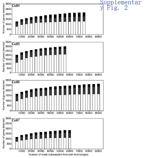 3. 7個(gè)B1a細胞全長(cháng)cDNA分別進(jìn)行二代Illumina轉錄組測序(73,086-351,876 150?bp reads/細胞)和三代ONT全長(cháng)轉錄組測序(R 7.3 17,749-52,696/R9.4 57,874-128,726 ONT reads/細胞),二者間進(jìn)行比較。