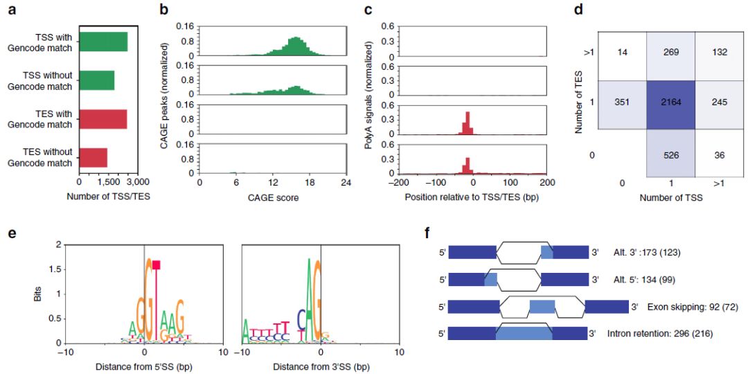 總共鑒定到24,887個(gè)5’剪接位點(diǎn)(SS)和24,756個(gè)3’剪接位點(diǎn)。絕大多數這些剪接位點(diǎn)由Illumina junction reads或GENCODE注釋支持。24,298(97.6%)個(gè)5’SS和24,220(97.8%)個(gè)3’SS分別與GENCODE注釋匹配。在與GENCODE注釋不匹配的589個(gè)5’SS和536個(gè)3’SS中,分別有250(42.4%)個(gè)5’SS和216(40.2%)個(gè)3’SS由在Illumina junction reads支持。就算假設所有無(wú)GENCODE注釋或Illumina reads支持的剪接位點(diǎn)都是假的(顯然這是不可能的),該方法的錯誤發(fā)現率僅為1.3%(659/49,643)。ONT RNAseq在確定√確剪接位點(diǎn)方面相對成功(上圖e為剪接位點(diǎn)堿基上下文context)。作者發(fā)現了296個(gè)內含子保留事件,134個(gè)可選的5’剪接位點(diǎn)和173個(gè)可選的3’剪接位點(diǎn)組合。大多數這些事件也在Illumina reads中觀(guān)察到,illumina reads支持216個(gè)(/296個(gè))內含子保留事件,99個(gè)(/134個(gè))可選5’剪接位點(diǎn),123個(gè)(/173個(gè))可選3’剪接位點(diǎn)和72個(gè)(/92個(gè))外顯子跳躍事件(上圖f)。