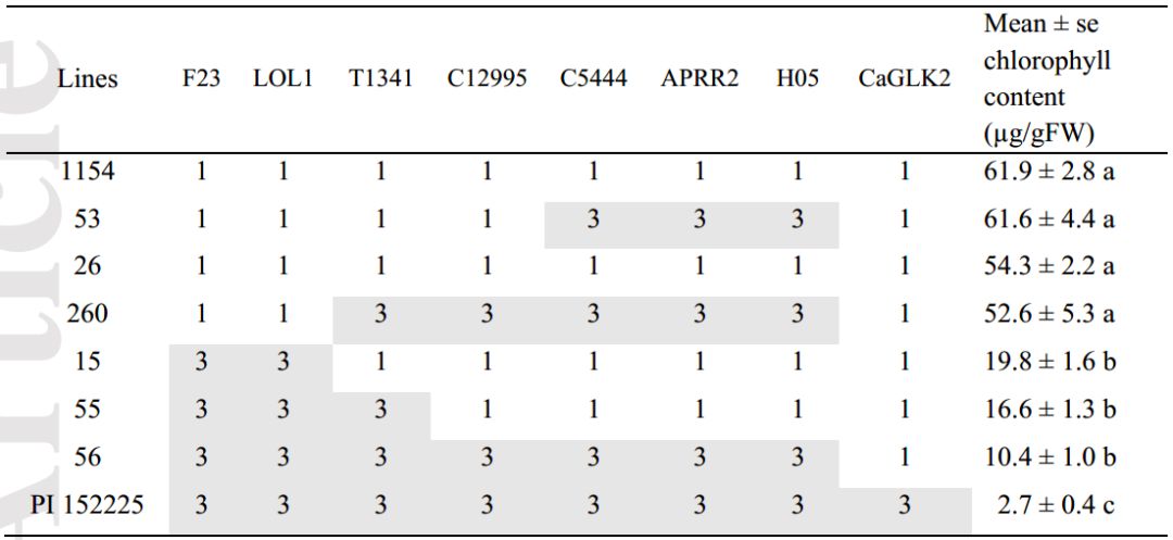 為進(jìn)一步精細定位pc1,本研究對624個(gè)F2(1154 × NIL 86-45)單株標記分型以篩選QTL區域內的交換單株?;谇捌谘芯?,標記T1341與QTL peak連鎖最為緊密 (Brand et al., 2012),作者又在T1341附近開(kāi)發(fā)出6個(gè)標記,在標記F23與H05間,共篩選出34個(gè)F4交換單株,可代表6種基因型組合,橫跨Chr.1:5cM的區間。為排除pc1pc10互作的影響,作者將所有交換單株的CaGLK2固定為1154等位基因。結果分析暗示,F23與LOL1是與QTL連鎖最為緊密的標記,因為line 15含PI 152225最短的導入片段且葉綠素含量顯著(zhù)低于1154,而line 260在這2個(gè)標記間含1154等位且與1154葉綠素含量沒(méi)有顯著(zhù)性差異。此外,lines 53與260在APRR2-like位點(diǎn)含有PI 152225等位,葉綠素含量卻與1154沒(méi)有顯著(zhù)差異,暗示此基因(APRR2)在本研究中的遺傳背景下不影響葉綠素含量(表1.)。