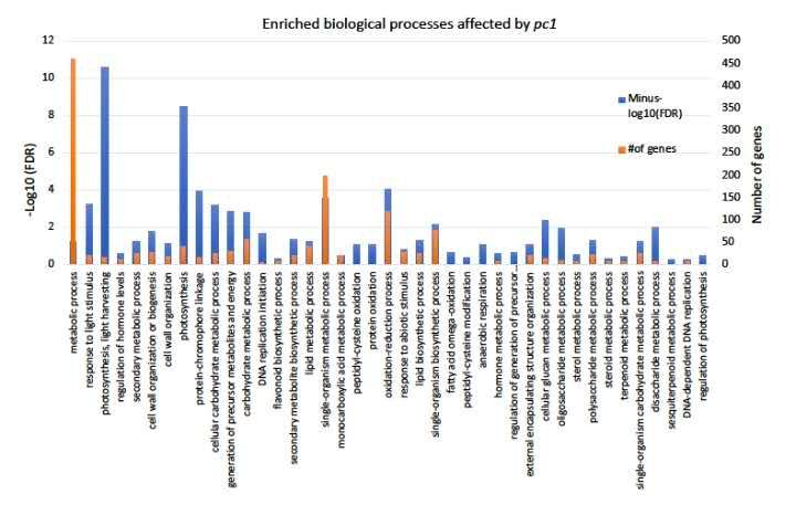 為研究pc1參與影響的細胞學(xué)過(guò)程,本研究對混池間983個(gè)差異表達基因進(jìn)行GO富集分析并根據生物過(guò)程進(jìn)行分類(lèi)(圖5)。最顯著(zhù)的GO term過(guò)程與光合作用及氧化還原有關(guān),這兩個(gè)過(guò)程包含184個(gè)DEGs,被分成17個(gè)亞類(lèi),其中最大的一類(lèi)是氧化還原過(guò)程。這一類(lèi)基因與葉綠素合成下調有關(guān),例如,POR,CAOHEMA1,還與葉綠素降解基因上調有關(guān),例如,CA00g73130,暗示葉綠素合成與降解受這個(gè)QTL調控。另一類(lèi)重要基因,包含Chlorophyll a/b-結合蛋白的多個(gè)成員基因(CA01g17090,CA02g12050,CA02g12060,CA02g12070等),在淡綠混池中下調表達,它們參與光合、蛋白發(fā)色團及光刺激響應等過(guò)程。另外,若干與碳固定有關(guān)的Rbc家族基因在淡綠混池中也呈現下調表達。