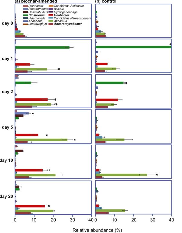 圖3. 生物炭修正(a)、無(wú)生物炭修正(b)水稻土壤的“屬”水平活性微生物的相對豐度差異比較(“*”號表示p<0.05。