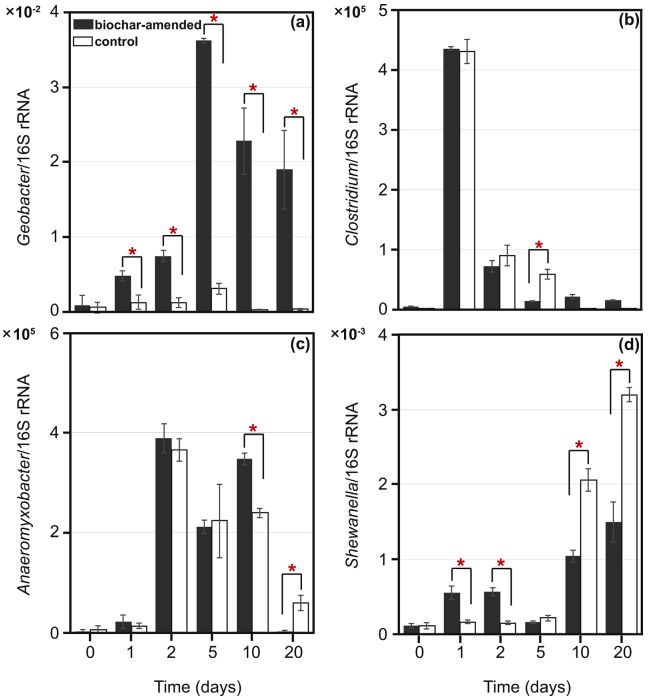 圖4. 生物炭修正與無(wú)生物炭修正的水稻土壤的(a):地桿菌(geobacter);(b)梭菌(clostridium);(c)厭氧粘細菌(Anaeromyxobacter)和(d)希瓦氏菌(Shewanella)的相對轉錄豐度。