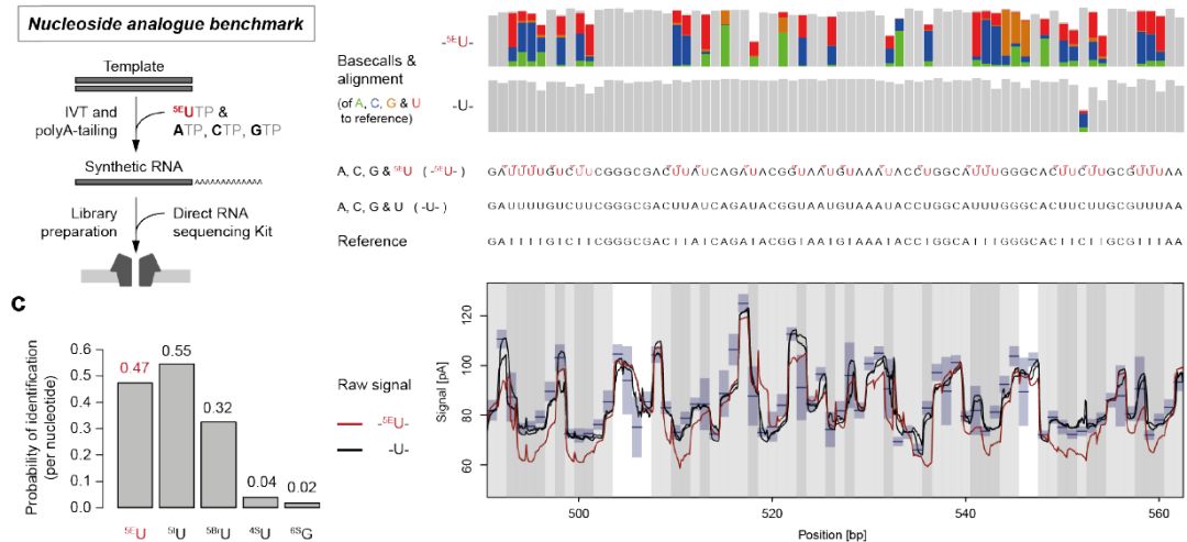 一個(gè)主要挑戰是尋找合適的核苷類(lèi)似物用于RNA標記和檢測標記的RNA isoform,已知標記效率限制在約2-3%,即100個(gè)天然核苷酸中只有2個(gè)或3個(gè)被核苷酸類(lèi)似物取代。作者利用ERCC標準品,分別以添加核苷酸類(lèi)似物和不添加的天然堿基作體外轉錄,將體外轉錄產(chǎn)物進(jìn)行nanopore direct RNA測序,比較了幾種不同的核苷酸類(lèi)似物:5EU(5-Ethynyluridine,5-乙炔基尿苷)、5BrU(5-bromouridine,5-溴尿苷)、5IU(5-iodouridine,5-碘尿苷)、4sU(4-thiouridine,4-硫代尿苷)和?6sG(6-thioguanine,6-硫鳥(niǎo)嘌呤)。最終結果表明:5EU和5IU標記檢出率比較高,且5EU對細胞無(wú)毒性。且5EU標記的新合成RNA中約有一半U可以被識別為5EU,且從原始電信號中可以明顯區分5EU和天然U堿基。選用5EU進(jìn)行體內實(shí)驗。