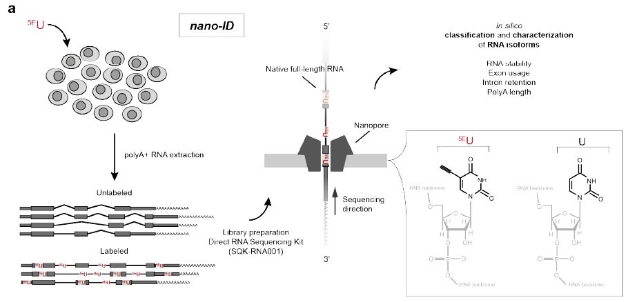 因此作者開(kāi)發(fā)了nano-ID(nanopore sequencing-based Isoform Dynamics ),其結合了代謝RNA標記、天然RNA分子的“長(cháng)讀長(cháng)”納米孔測序和機器學(xué)習。