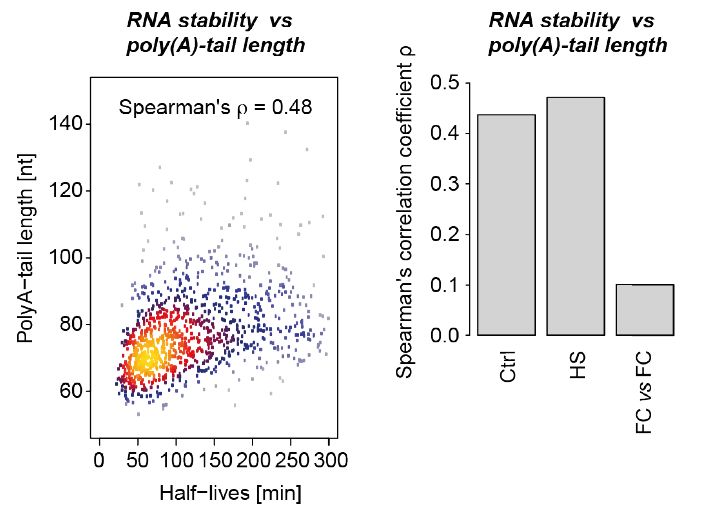 熱休克反應(42°C 60min)處理,許多RNA isoform改變了合成速率、穩定性和剪接模式。nano-ID分析結果表明,對于某一個(gè)基因座對應的組合RNA混合物(基因水平)的代謝變化與單一轉錄本代謝變化差異非常大。雖然組合的RNA穩定性與poly(A)尾巴長(cháng)度相關(guān),但是單個(gè)RNA isoform可以顯著(zhù)偏離。nano-ID能夠在不同細胞狀態(tài)和條件下研究單個(gè)RNA分子和isoform水平的RNA代謝。