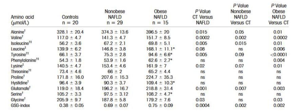 使用GC-MS檢測血漿中氨基酸含量,NAFLD患者血漿中異亮氨酸和纈氨酸(支鏈氨基酸),酪氨酸(芳香族氨基酸),丙氨酸,賴(lài)氨酸和谷氨酸含量較高,而血漿甘氨酸濃度顯著(zhù)下降。大部分患者的BMI小于30 kg/m2,然而,大多數氨基酸僅在NAFLD-Ob(肥胖的NAFLD患者)中增加。與CT相比,NAFLD-NO(非肥胖的NAFLD患者)中只有丙氨酸、谷氨酸、異亮氨酸和纈氨酸濃度增加。另外,患者有更高的肝酶活(ALT、GGT、AST)。