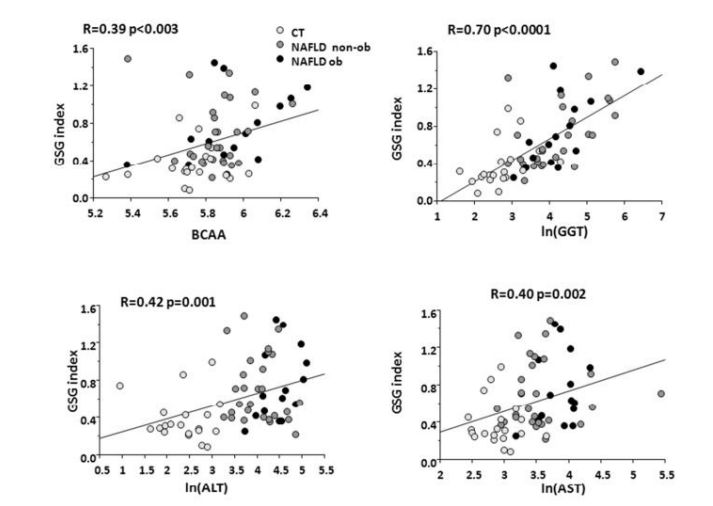 這些氨基酸以某種方式參與合成谷胱甘肽(GSH)和脂毒性相關(guān)的脂質(zhì)前體。 因此,我們測試了GSG指數與肝臟組織學(xué)改變的相關(guān)性,其中GSG-index指數計算了[Glutamate/(Serine+Glycine)]。