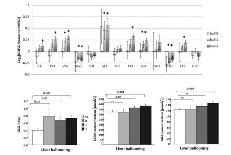 我們首先檢測肝臟炎癥和氣球樣變時(shí)哪些氨基酸的濃度改變。相比于對照組,氣球樣變2級的患者血漿中BCAA、AAA、谷氨酸,丙氨酸和賴(lài)氨酸含量增加,而甘氨酸和蘇氨酸濃度下降。 氨基酸濃度也與肝纖維化增加有關(guān),但在纖維化評分為3和4的NAFLD中觀(guān)察到的濃度與纖維化評分為0-2的患者沒(méi)有顯著(zhù)差異。