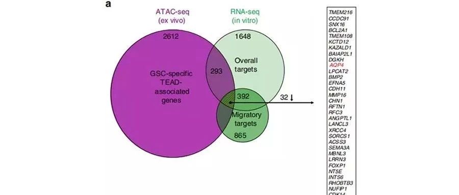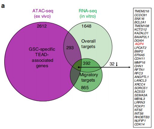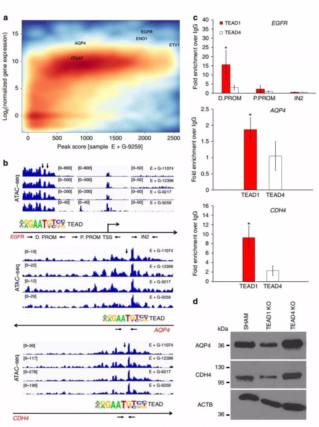GSC中TEAD1可接近區域peak(ATAC-seq)和基因表達水平(RNA-seq)的一致性分析,結合GBM中TEAD1與基因共表達(TCGA中的GBM RNA-seq數據)分析,發(fā)現TEAD1的靶基因包括EGFR、AQP4、CDH4、TNC等多個(gè)候選靶基因。