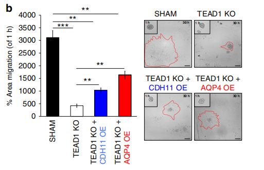作者利用不同亞型人GBM腫瘤樣本,通過(guò)ChIP-PCR對TEAD1的候選靶基因進(jìn)行驗證。進(jìn)一步結合TEAD1KO相比于對照的異種移植樣本中靶基因表達水平,EGFR、AQP4、CDH4在TEAD1KO樣本中表達下調,因此,TEAD1可能是通過(guò)結合靶基因EGFR、AQP4、CDH4調控其表達進(jìn)而參與GBM遷移。