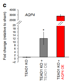 作者通過(guò)ATAC-seq和轉錄組測序數據篩選出來(lái)TEAD1的候選靶基因,并進(jìn)一步利用ChIP-PCR,驗證了與TEAD1結合的靶基因–AQP4、EGFRCDH4。TEAD1敲除使AQP4下調,TEAD1過(guò)表達可恢復AQP4的表達,而TEAD1和AQP4過(guò)表達均可修復TEAD1KO細胞的遷移缺陷,說(shuō)明TEAD1作用于靶基因AQP4,調控其表達,進(jìn)而參與GBM遷移的直接調控機制。