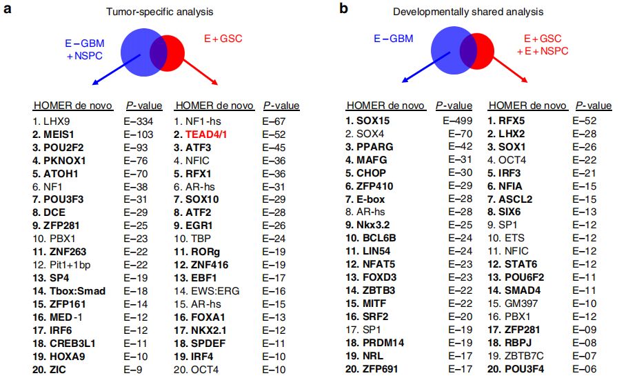 通過(guò)ATAC-seq分析染色質(zhì)的可及性,不僅可以識別轉錄的調控區域,還可以推斷出其中的TF活性。在此,作者鑒定了27個(gè)GSC腫瘤特異性的TF motif,26個(gè)在E+GSC和E+NSPC中共有的發(fā)育相關(guān)TF motif。其中,TEAD1/4是具有很高活性的TF( motif是GSC特有peak中顯著(zhù)富集,且基因表達水平高),其它候選TF包括ATF3、RFX1、FOXA1等。而E+GSC和E+NSPC中共有的發(fā)育相關(guān)TF包括SOX1、IRF3、NFIA等。然后,作者利用以前的類(lèi)似的E+/E-GBM的RNA-seq數據,考慮到腫瘤特異性TF的基因表達水平,其中只有TEAD1在E+GSC中差異過(guò)表達。