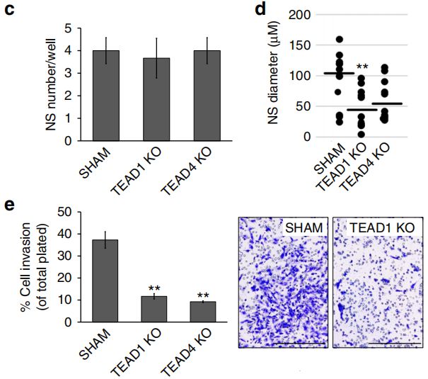 作者通過(guò)ATAC-seq繪制了膠質(zhì)母細胞瘤干細胞(GSC)和神經(jīng)干細胞(NSPC)的全基因組染色質(zhì)開(kāi)放區域圖譜,并結合轉錄組測序數據發(fā)現了在腫瘤細胞遷移中起關(guān)鍵作用的轉錄因子TEAD1,并通過(guò)細胞和異種移植模型水平上的TEAD1的敲除與過(guò)表達的體內外功能驗證實(shí)驗,驗證了TEAD1促進(jìn)遷移的功能性作用。