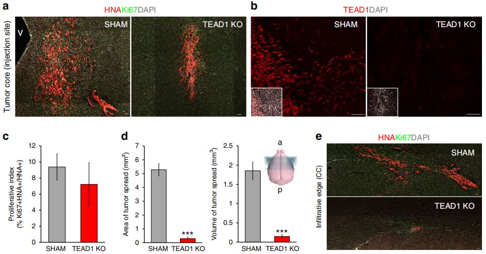 此外,作者分析了所有TEAD家族成員(1-4)在TCGA數據庫RNA-seq數據中的表達水平,發(fā)現TEAD1是150個(gè)GBM樣本中表達最高的TEAD家族成員,且在蛋白水平上,TEAD1在PDX膠質(zhì)瘤中表達。因此,TEAD1是GBM腫瘤中表達最高、表達最廣泛的TEAD家族成員。