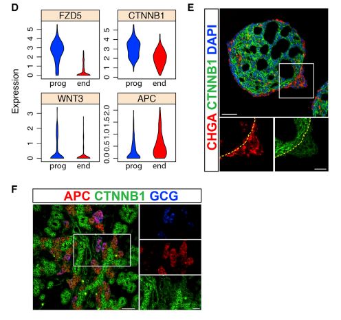 為了研究調節未分化祖細胞與內分泌細胞之間整體平衡的遺傳途徑,基于上皮祖細胞及內分泌細胞差異表達的基因,發(fā)現祖細胞中上調表達的轉錄本富集于Wnt活化相關(guān)的因子,包括配體WNT3和通路主要傳感器β-catenin,蛋白水平也類(lèi)似(圖BDE);相反,APC作為WNT活性抑制分子,在內分泌細胞中是上調的(圖D)。在小鼠胚胎中,APC蛋白在內分泌半島區域唯一檢出,在上皮索中β-catenin 水平升高(圖 F)。
