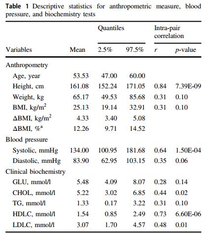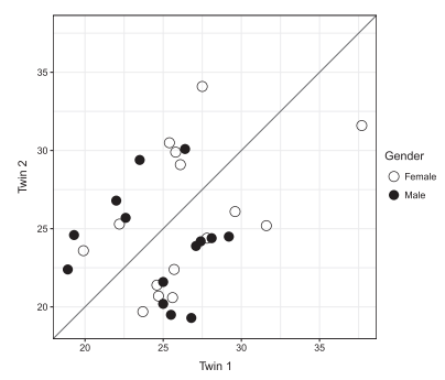 表1展示了樣本相關(guān)人體測量和生化變量的結果。最后一列是每個(gè)變量的對內相關(guān)性。大多數變量具有相當高的和/或顯著(zhù)相關(guān)性,一些顯示低或不顯著(zhù)的對內相關(guān)性(例如GLU,TG)。下圖顯示了每對雙胞胎的BMI測量值。所有雙胞胎都與對角線(xiàn)保持距離,表明BMI測量中的對內不一致。同時(shí),圖中的總體模式還表明如表1中報告的BMI的弱配對內相關(guān)性(r = 0.307,p = 0.099)。在男性(實(shí)點(diǎn))和女性(空點(diǎn))雙胞胎中沒(méi)有觀(guān)察到BMI不一致的性別特異性模式。