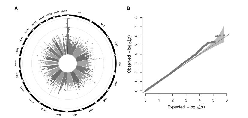 基于單個(gè)位點(diǎn)的EWAS分析,鑒定出136個(gè)CpG(p <1e-04),其中30個(gè)CpG(p <1e-05),2個(gè)CpG(p <1e-06)。 沒(méi)有位點(diǎn)達到全基因組顯著(zhù)性(定義為FDR <0.05),最低FDR = 0.195。 圖中顯示了每個(gè)CpG位點(diǎn)的p值與其染色體位置的曼哈頓圖(圖a)和針對隨機預期p值分布繪制的預估p值的Q-Q圖(圖b)。最顯著(zhù)CpG?p值表明與隨機分布的偏差及其陰影區域的95%置信區間(圖b),說(shuō)明這些CpG與BMI的非隨機關(guān)聯(lián)。