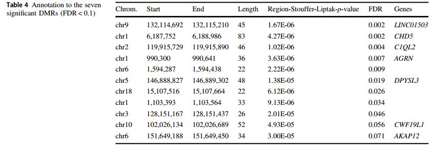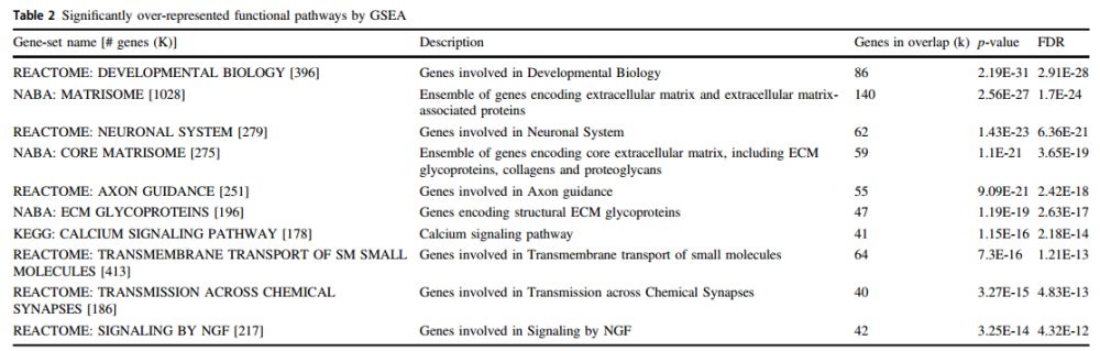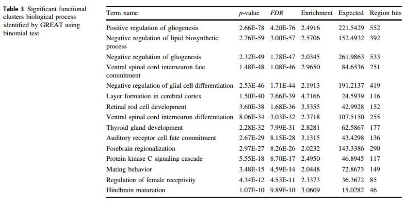 采用biomaRt,38487個(gè)CpG中(P<0.05),23,863個(gè)CpG注釋到2542個(gè)功能基因,基于GSEA在BioCarta 基因集, KEGG 基因集和Reactome基因集富集分析。富集通路相關(guān)基因包括參與編碼細胞外基質(zhì)(ECM)相關(guān)蛋白,包括ECM糖蛋白、膠原蛋白和蛋白多糖;以及參與神經(jīng)元系統和發(fā)育生物學(xué)的基因。富集結果也涉及神經(jīng)元功能通路,涉及參與化學(xué)突觸傳遞,軸突導向和NGF信號傳導(神經(jīng)生長(cháng)因子)的基因。38,487(p < 0.05)個(gè)CpGs采用GREAT分析其富集的調控區域。結果表明15個(gè)具有統計學(xué)意義(p < 1.072e-10)的生物學(xué)功能聚類(lèi),涉及膠質(zhì)細胞再生正負調節(FE:2.49, FE:2.03)、脂質(zhì)合成負調節( FE:2.61)、甲狀腺發(fā)育 (FE:2.83)、視網(wǎng)膜桿細胞發(fā)育(FE: 3.54)等。